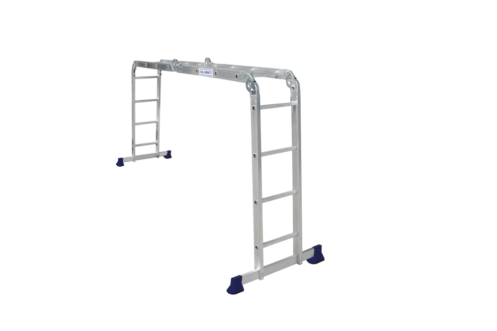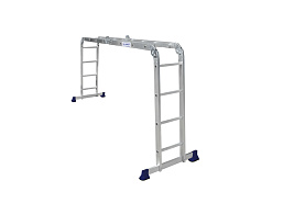 Благодаря трасформируемой конструкции принимает несколько положений: обычная лестница, стремянка, помост и Г-образное положение, подходящее для рельефных поверхностей.