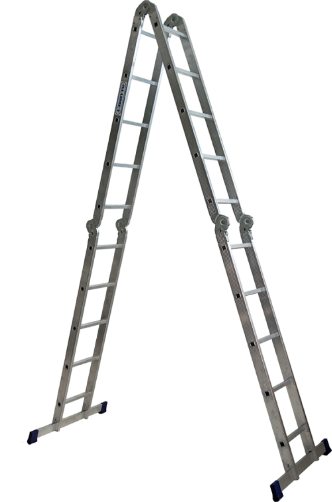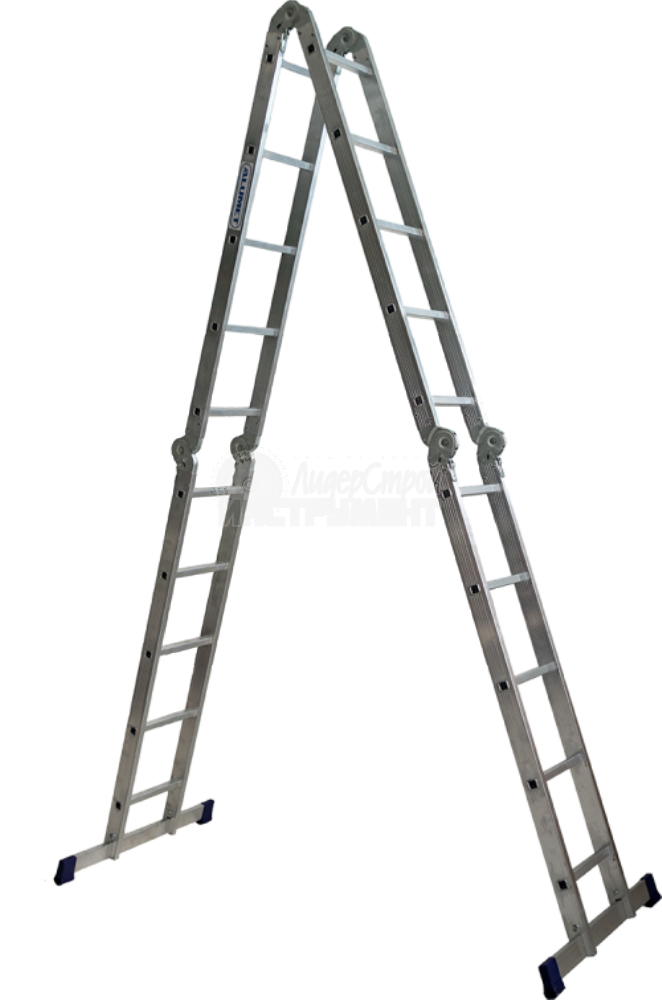 Благодаря трасформируемой конструкции принимает несколько положений: обычная лестница, стремянка, помост и Г-образное положение, подходящее для рельефных поверхностей.
