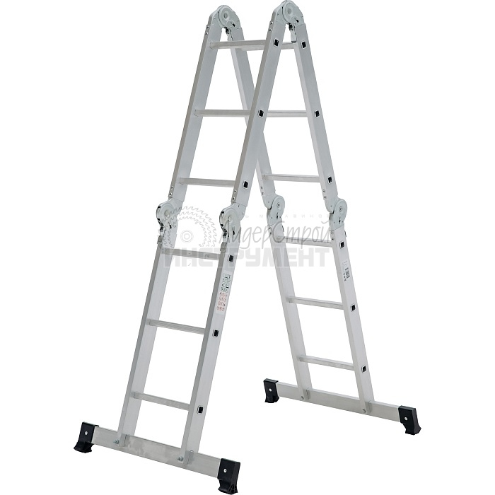 Благодаря трасформируемой конструкции принимает несколько положений: обычная лестница, стремянка, помост и Г-образное положение, подходящее для рельефных поверхностей.
