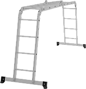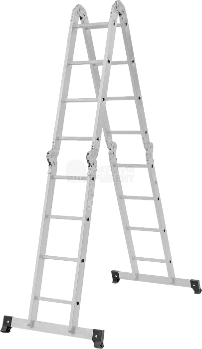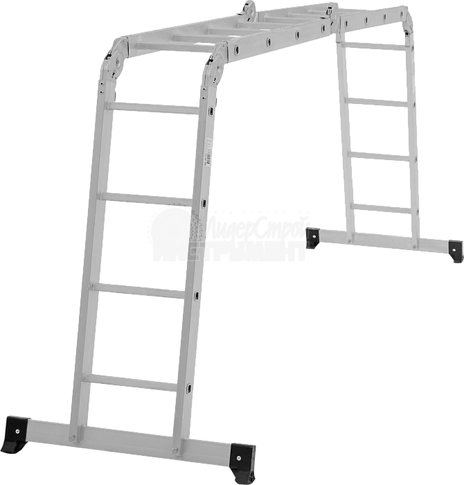 Благодаря трасформируемой конструкции принимает несколько положений: обычная лестница, стремянка, помост и Г-образное положение, подходящее для рельефных поверхностей.