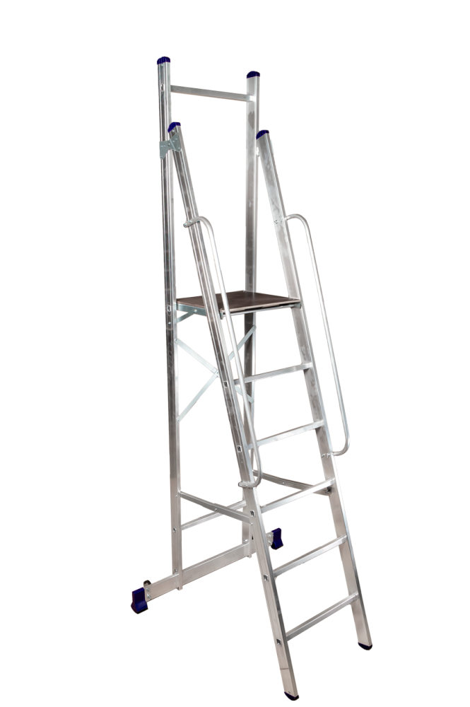 Благодаря трасформируемой конструкции принимает несколько положений: обычная лестница, стремянка, помост и Г-образное положение, подходящее для рельефных поверхностей.