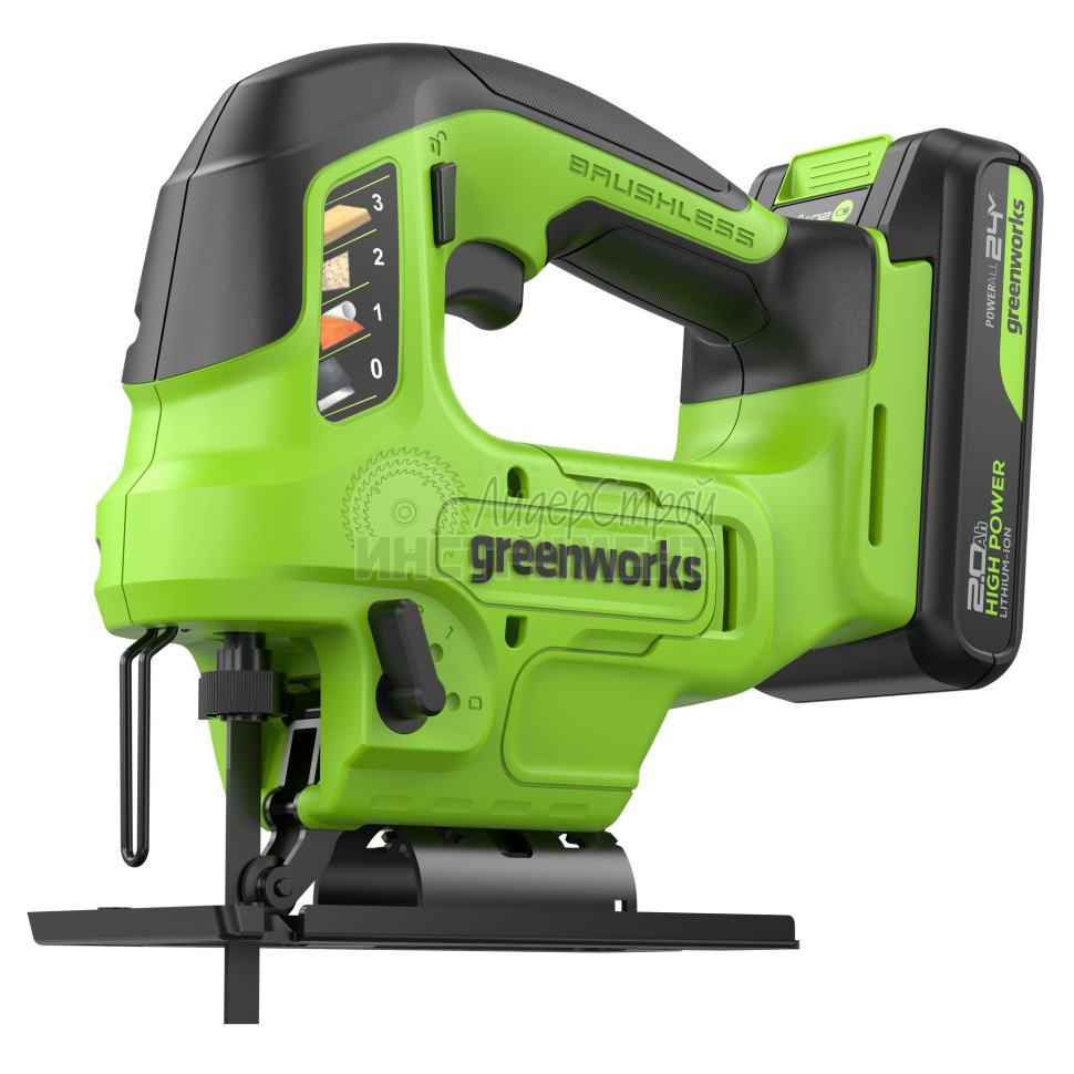 Лобзик аккумуляторный Greenworks GD24JS90, 24V, б/щет, 90 мм, 0-3000/мин, 4 ст. маятник, LED, 1х2Ач, ЗУ – производительный и компактный аккумуляторный лобзик c классической скобовидной рукояткой закрытого типа. Совместим со всем существующим ассортиментом лобзиковых полотен с Т-образным хвостовиком.