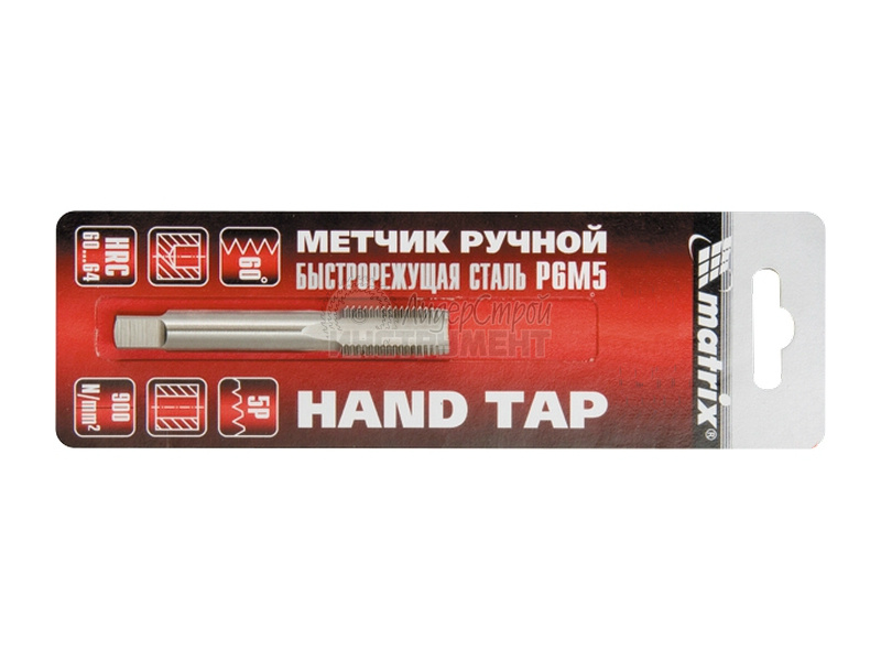 Метчик арт. 76677 производителя MATRIX ‒ качественный инструмент для нарезки резьбы в глухих и сквозных отверстиях. Отличается повышенной устойчивостью к износу, т.к. изготовлен из быстрорежущей стали Р6М5. Твердость инструмента составляет 60‐64 HRс, класс точности ‒ 4H.