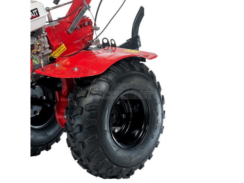Мотоблок оснащен широкими пневматическими колесами. Они не повреждают посадки и газон, обеспечивая проходимость и маневренность на разных типах грунта.