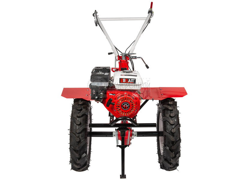 Мотоблок BRAIT-135GBPRO предназначен для обработки больших участков земли. Мощность двигателя даёт возможность применять в работе широкий спектр навесного оборудования. Агрегат имеет вал отбора мощности. Мотоблок можно дополнить роторной сенокосилкой, мотопомпой, снегоуборочной приставкой и другим оборудованием. Двигатель этого агрегата имеет мощность 9.0 лошадиных сил, произведён по спецификации знаменитого завода LIFAN. Топливный бак объёмом 6.5 литров и экономичный расход топлива, дают возможность долгое время работать без дозаправки. Высококачественная коробка передач имеет 3 скорости вперёд и 1 назад. Аппарат оснащён мощным, цельнолитым чугунным редуктором, созданным специально для эксплуатации в жёстких условиях на тяжёлых грунтах и для обработки целины. Зубчатая передача, которая сообщает крутящий момент двигателя колёсам и фрезам, отличается надёжностью и долговечностью. Сцепка мотоблока изготовлена с большим запасом прочности и позволяет работать не только с сошником, плугом или окучником, но и с телегой. Мотоблок адаптирован с навесным оборудованием КАСКАД/ЦЕЛИНА. Ширину обработки при работе с фрезами можно регулировать от 800 мм. до 1200 мм., кроме этого агрегат массой в 150 кг. способен работать плугом без дополнительного утяжеления. Шестигранные оси мотоблока (посадка 32мм.) обеспечивают надёжное соединение.