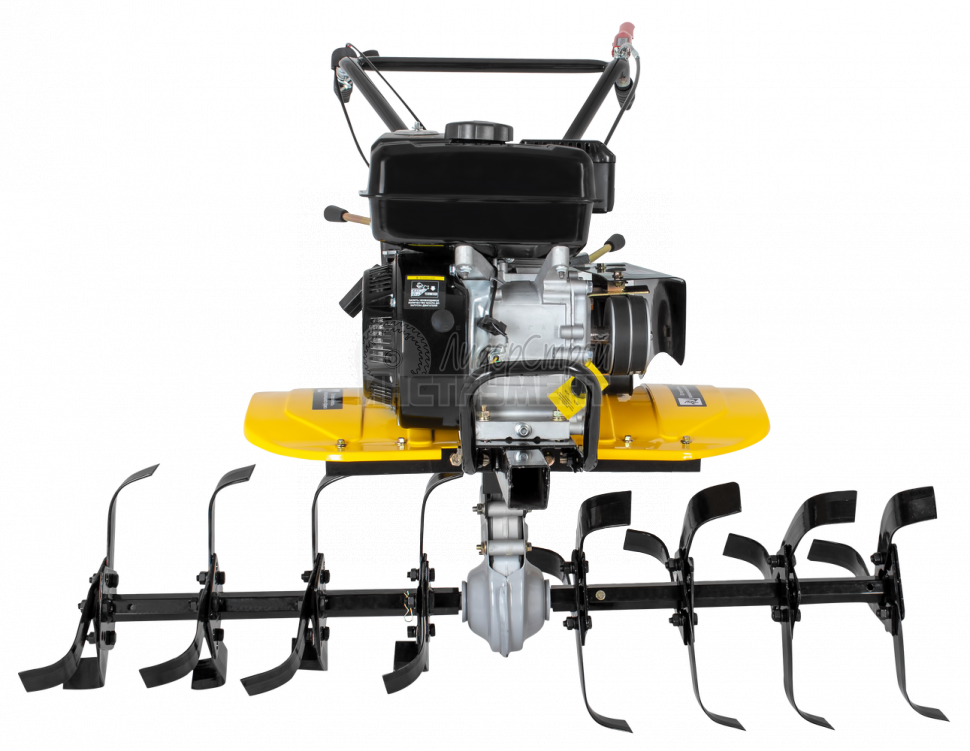 Комплектуется бензиновым двигателем мощностью 7 л.с. Запуск мотора осуществляется вручную.