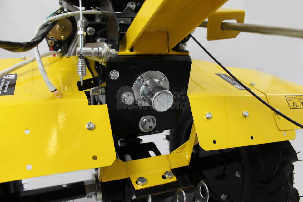Вал отбора мощности обеспечивает подключение к мотоблоку роторной косилки, бороны, плуга, окучника, поливочного и уборочного оборудования, отбрасывателя, прицепа и много другого. Модель совместима с навесным оборудованием марок Каскад и Нева.