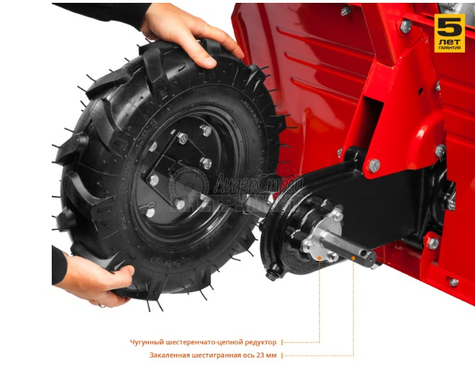3 скорости вперед (понижающая, основная и повышающая) и 1 назад позволяют комфортно работать на любых типах почвы