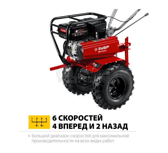 4 скорости вперед (основная и повышающая) и 2 назад позволяют комфортно работать на любых типах почвы