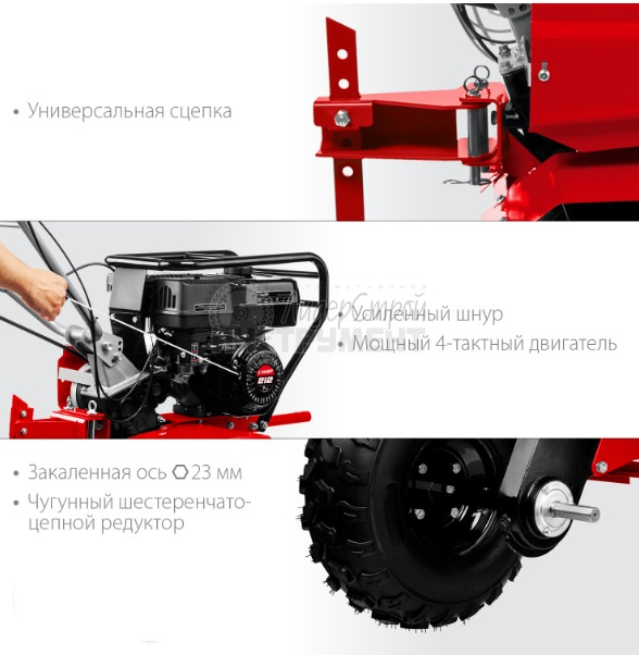 Надёжный и манёвренный мотоблок для рыхления и культивации почвы на приусадебном участке. Эффективный двигатель с воздушным фильтром в масляной ванне увеличивает моторесурс. Складываемые, регулируемые по положению рукоятки и транспортное колесо облегчают эксплуатацию, транспортировку и хранение.