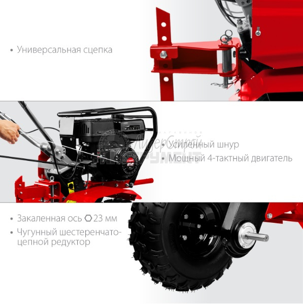 Мощный бензиновый мотоблок предназначен для рыхления и культивирования, а при использовании дополнительного навесного оборудования спектр применения мотоблока значительно расширится. Модель предлагает отличное сочетание высокой производительности, управляемости и устойчивости.