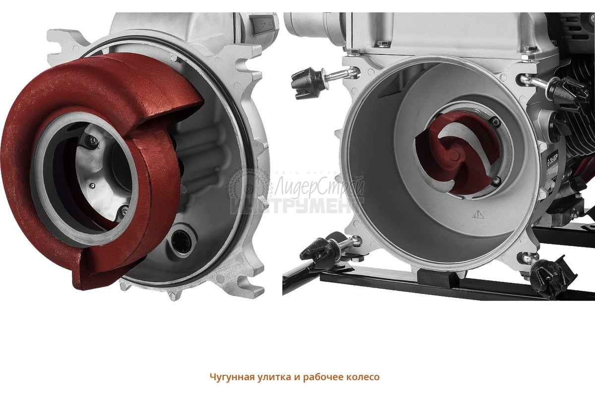 Простой доступ к насосной части благодаря оригинальному крепежу значительно упрощает обслуживание мотопомпы.