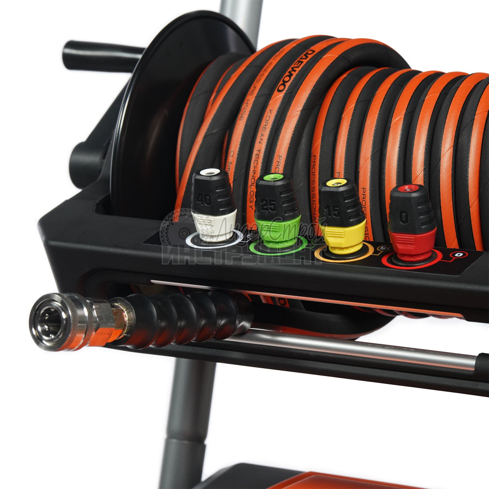 - армированный шланг 15 м на катушке с направляющей, предотвращающий перекручивание;