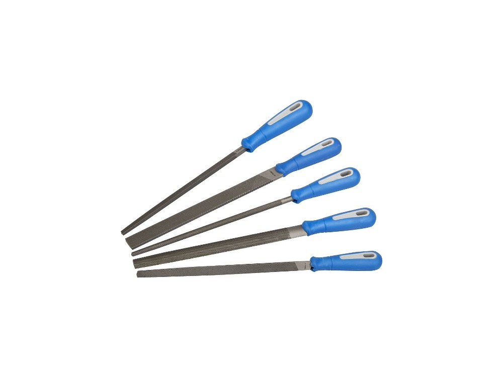 Набор напильников с двухкомпонентной ручкой: плоский, полукруглый, трехгранный, квадратный, круглый, №2, 250мм ЗУБР ЭКСПЕРТ 16651-25-H5 - комплект из 5 предметов различных конфигураций, которые предназначены для обработки простых и фасонных твердых металлических деталей в условиях индустриального применения.
