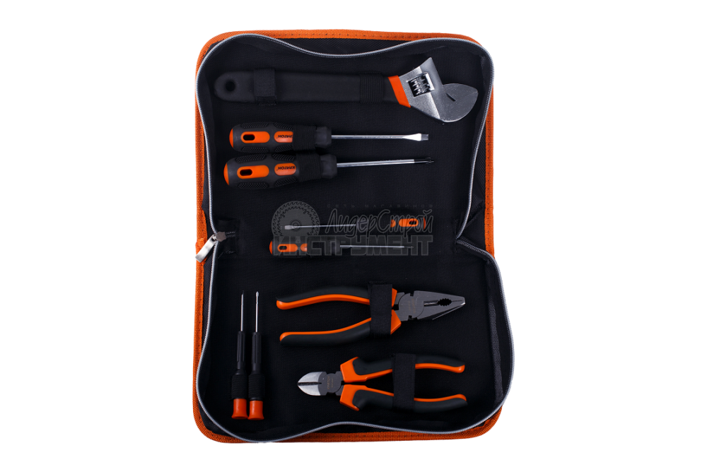 Комплектность (9 предметов): Пассатижи – 180мм Бокорезы – 150мм Ключ разводной – 255мм Отвертка РН0 – 75мм Отвертка РН1 – 100мм Отвертка SL3 – 75мм Отвертка SL5 – 100мм Отвертка часовая РН00 – 40мм Отвертка часовая SL2 – 40мм