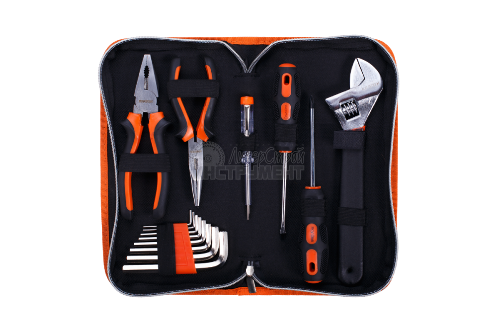 Комплектность (14 предметов): Пассатижи – 180мм Тонкогубцы – 150мм Ключ разводной – 255мм Отвертка РН2 – 100мм Отвертка SL5 – 100мм Ключ шестигранный – 2; 2,5; 3; 4; 5; 6; 8; 10мм Отвертка тестер