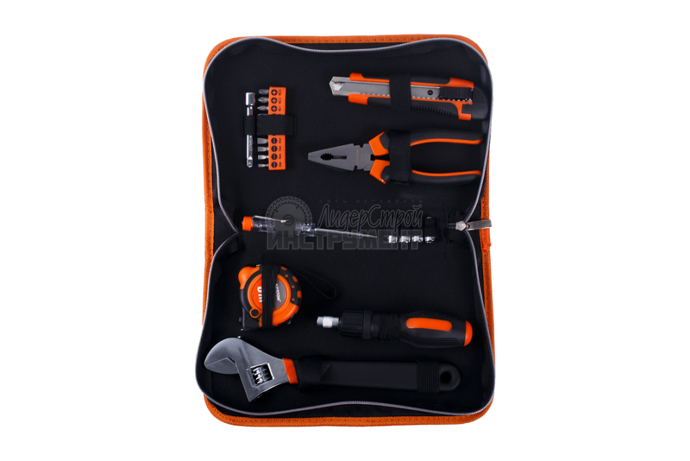 Комплектность (20 предметов): Пассатижи – 180мм Ключ разводной – 255мм Отвертка для бит реверсивная Биты 10шт – РН0, РН1, РН2, НЕХ4, НЕХ5, TR15, TR25, TR30, SL3, SL5 Головки – 8, 10, 12, 13 мм Отвертка тестер Нож – 18мм Рулетка – 3м