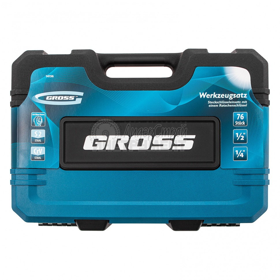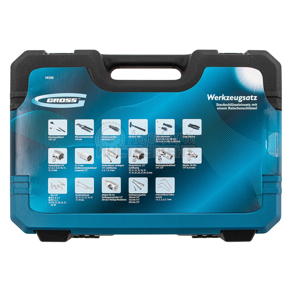 Набор инструментов Gross 14156, 1/4 и 1/2 дюйма, CrV, включает 76 предметов, в том числе ключи-трещотки со 120 зубьями, и предназначен для работы в гараже, а также домашнего ремонта. В комплекте инструменты для монтажа и демонтажа резьбовых соединений, а также переставные клещи и пассатижи, использующиеся для захвата и удержания деталей, и молоток для ударных работ. Вороток, удлинители и карданные шарниры облегчают манипуляции в стесненных условиях. Для хранения и транспортировки предусмотрен кейс из ударопрочного пластика с надежными металлическими замками.