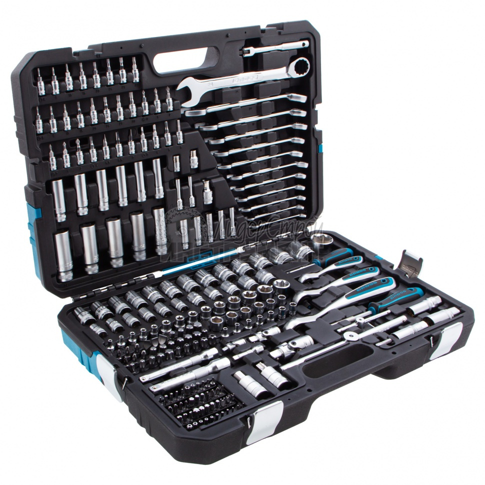 Набор инструментов Gross 14157, CrV, 1/2, 3/8, 1/4 дюйма, включает 216 предметов, в том числе трещоточные ключи со 120 зубьями. Набор используется для монтажа и демонтажа резьбовых соединений. Будет полезен во время ремонта автомобиля, а также пригодится дома или на даче. В комплект входят воротки, удлинители и карданные шарниры для работы в труднодоступных местах. Удлинители имеют профиль под гаечный ключ для увеличения крутящего момента. Ударопрочный кейс из жесткого пластика, закрывающийся на металлические замки, обеспечивает сохранность инструментов во время хранения и транспортировки.