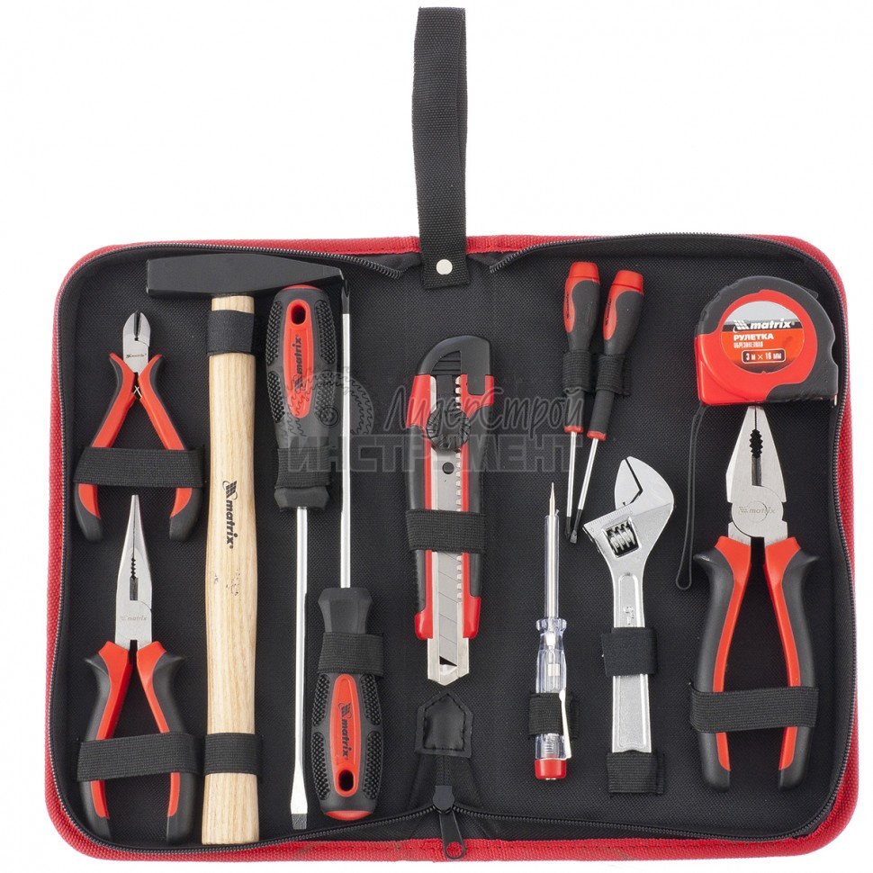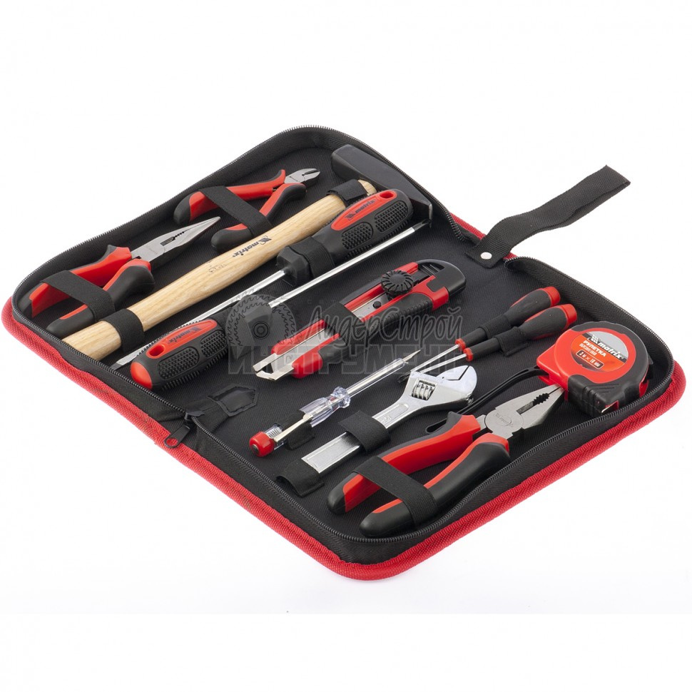 Набор инструментов из 12 предметов. В комплект входят длинногубцы, отвертка-тестер, пассатижи, молоток слесарный 200 г, отвертки SL 6 х 150 мм, РН 2 х 150 мм, две часовые отвертки: 2 х 50 мм, РН 00 х 50 мм; кусачки мини, ключ разводной, нож технический 18 мм, рулетка 3 м х 13 мм.