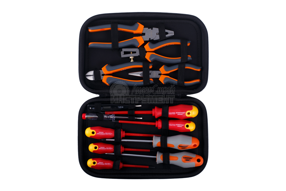 Набор инструментов из 12 предметов. В комплект входят длинногубцы, отвертка-тестер, пассатижи, молоток слесарный 200 г, отвертки SL 6 х 150 мм, РН 2 х 150 мм, две часовые отвертки: 2 х 50 мм, РН 00 х 50 мм; кусачки мини, ключ разводной, нож технический 18 мм, рулетка 3 м х 13 мм.