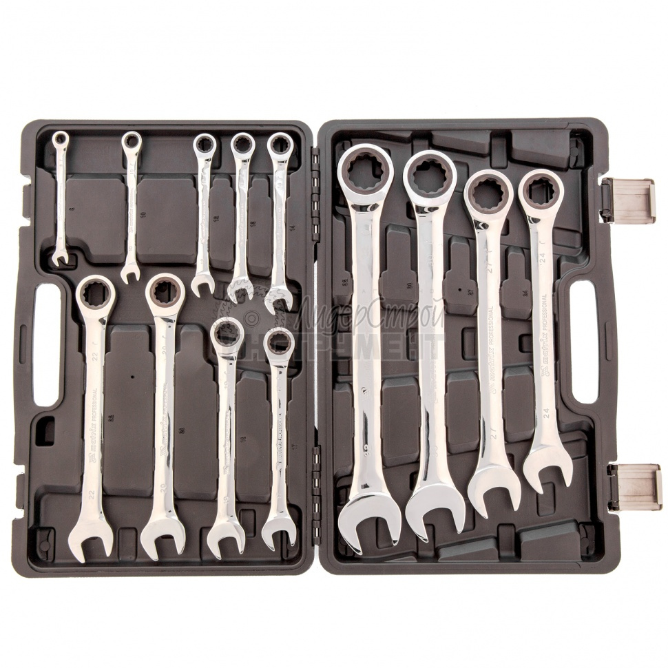 Набор комбинированных ключей, 6-32 мм, предназначен для ремонтных работ, когда необходимо осуществить монтаж или демонтаж резьбовых соединений. Изготовлен из хромованадиевой стали и имеет хромоникелевое покрытие, что обеспечивает высокую прочность и долговечность. Твердость материала соответствует ГОСТу (48 HRс). Профиль каждого ключа имеет двенадцать граней, что обеспечивает больший захват рабочей поверхности. Головка ключа находится под углом 15 градусов к основной оси, что делает работу более эффективной. Для удобства хранения и транспортировки предусмотрен чехол, в котором каждый ключ находится в отдельном кармане.