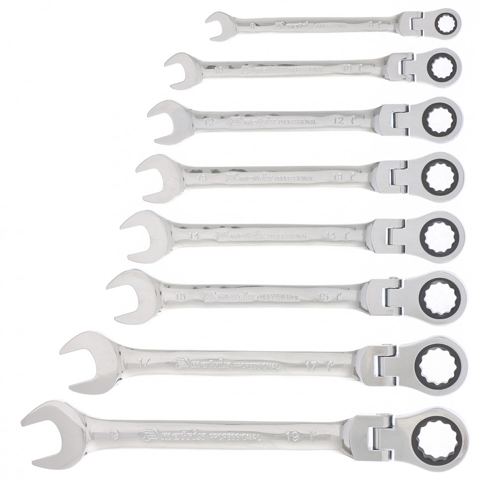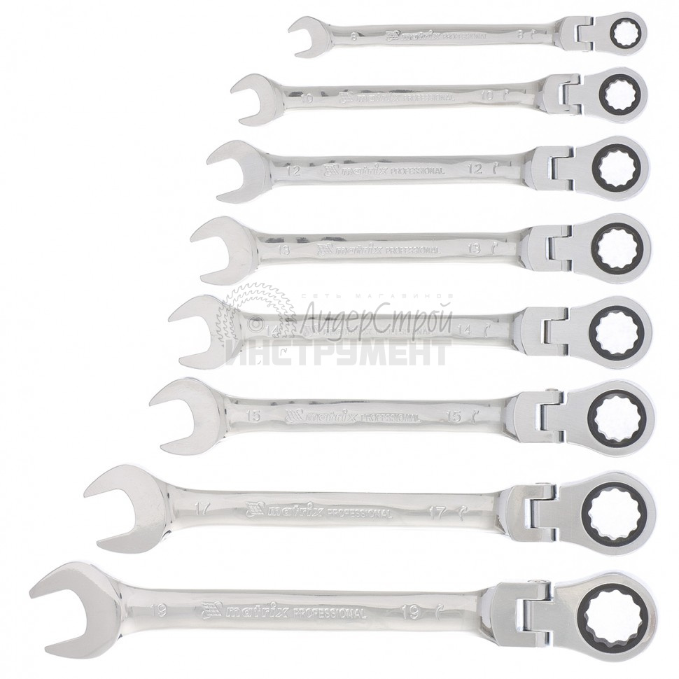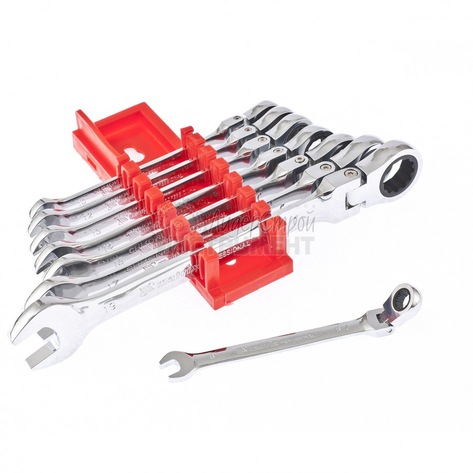 Ключи изготовлены из хромованадиевой стали. Твердость материала рабочей части ключа 45 HRc (требования ГОСТ – 45–51 HRc). Ключи имеют полированное хромоникелевое покрытие. Поставляются в комплекте с трапециевидным пластмассовым держателем. Профиль кольцевого зева имеет 12 граней, что увеличивает площадь соприкосновения рабочих поверхностей и снижает риск деформации граней крепежа при монтаже. Угол наклона кольцевого зева относительно плоскости ключа в 15 градусов делает монтаж более удобным. Набор предназначен для монтажа/демонтажа резьбовых соединений.