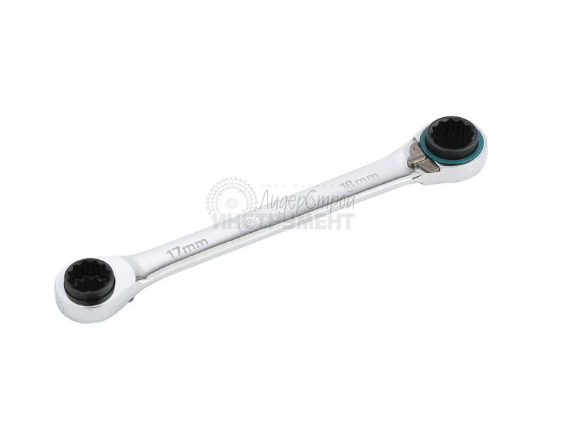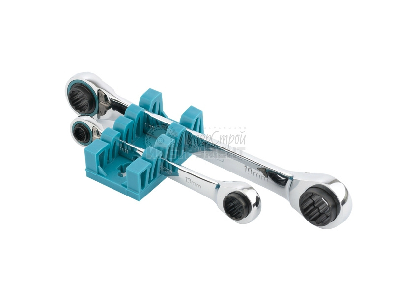 Набор накидных ключей торговой марки GROSS предназначен для монтажа/демонтажа резьбовых соединений (болтов, гаек и пр.). Инструмент изготовлен из высококачественной хромованадиевой (Crv) стали. Набор состоит из двух ключей, оснащенных реверсивным 72-зубчатым храповым механизмом, который позволяет эффективно и быстро проводить работы с резьбовыми соединениями. Первый ключ оснащен захватами 8 х 10 мм с одной стороны и 12 х 13 мм с противоположной, второй ключ соответственно 14 х 17 мм с одной стороны и 18 х 19 мм с противоположной. Минимальный угол поворота ключа GROSS составляет 5 градусов. Хромоникелевое покрытие улучшает антикоррозийные свойства инструмента. Упакован ключ в пластиковую подвесную карту удобную для размещения на стенде.