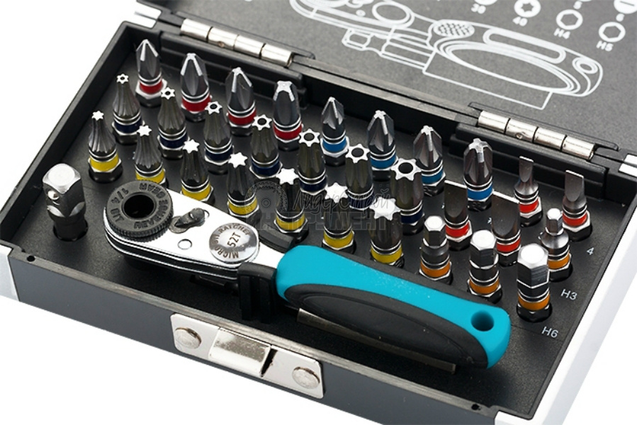 Набор бит и торцевых головок торговой марки GROSS предназначен для монтажа/демонтажа резьбовых соединений при проведении слесарно-монтажных работ. В наборе 30 бит, изготовленных из высококачественной инструментальной стали S2, со шлицами PH1, PH2, PH3, PZ1, PZ2, PZ3, T10, T15, T20, T25, T27, T30, T40, H3, H4, H5, H6, SL3, SL4, SL5, SL6, ТН10, ТН15, ТН20, ТН25, ТН27, ТН30 и ТН40, которые являются наиболее востребованными при проведении различных работ. Для соединения разных типоразмеров в наборе предусмотрен переходник с шестигранника на квадрат длиной 25 мм. Со стороны квадрата в переходнике установлен металлический шарик-фиксатор. Битодержатель из хромированной стали снабжен магнитом, который предотвращает выпадение бит во время работы. Храповой механизм набора (52–зубная трещотка) снабжен эргономичной двухкомпонентной рукояткой, которая удобно располагается в руке и не выскальзывает во время наибольшего крутящего момента.