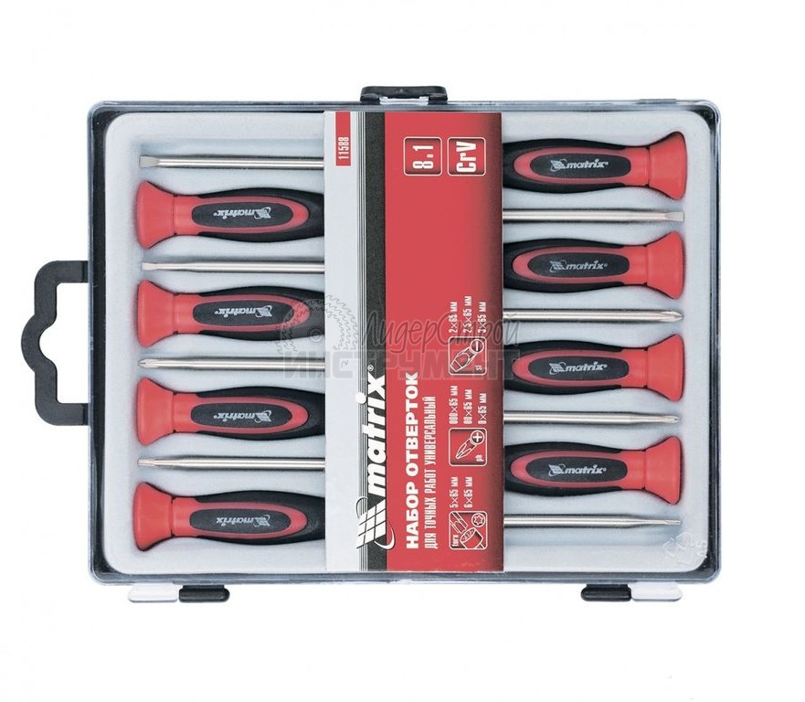 Набор отверток торговой марки Matrix предназначен для завинчивания и отвинчивания резьбовых соединений маленького размера. Отвертки из данного набора незаменимы при работе с электроникой, часами и прочими мелкими соединениями. Эргономичная двухкомпонентная рукоятка удобно располагается в руке и позволяет с ювелирной точностью манипулировать мелкими деталями. Тыльная сторона отвертки оснащена поворотной шайбой. При помощи шайбы можно легко и быстро вращать инструмент простым перебором пальцев. Упакован набор в пластиковый бокс, удобный для хранения и транспортировки.