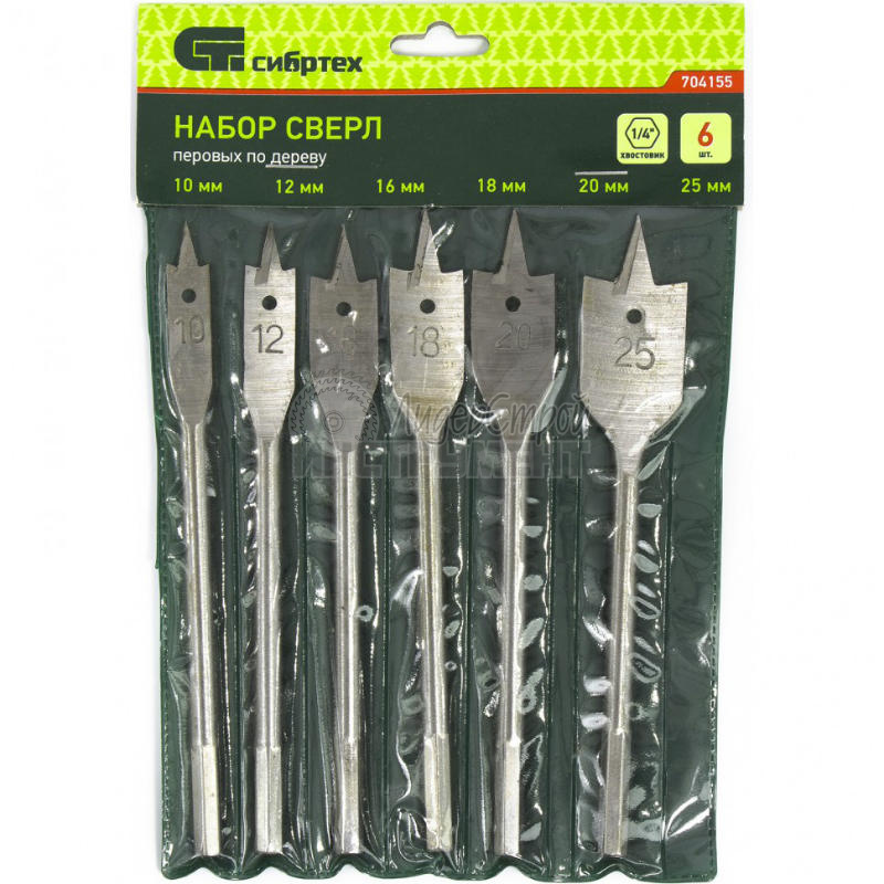 Перовые сверла изготовлены из углеродистой стали. Твердость режущих кромок 45–54 HRc. Предназначены для сверления отверстий в древесине. Комплектация: 10-12-14-16-18-20-25 мм. Набор комплектуется удлинителем 300 мм. Хвостовики имеют шестигранную форму, что предотвращает поворот сверла. Центрирующее острие исключает необходимость в предварительном засверливании.