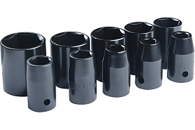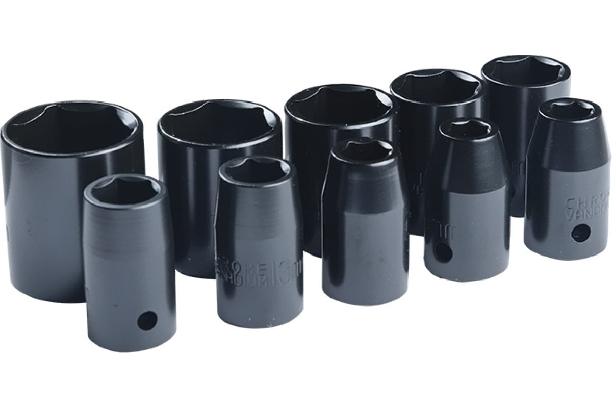 Набор из 12 шестигранных головок используется при монтаже, демонтаже крепежных изделий в слесарных работах и автомастерских. Применяется с пневматическим гайковертом в ударном и безударном режиме. В комплект входят головки диаметром от 10 до 24 мм.