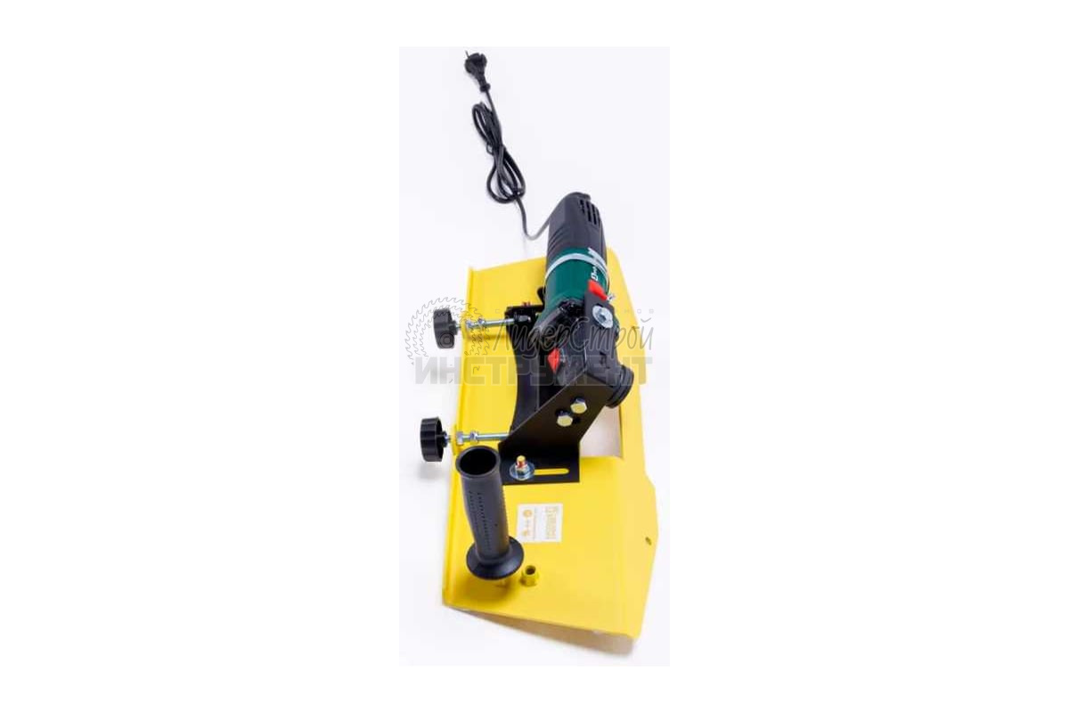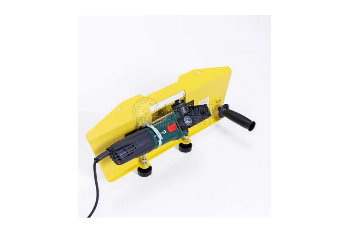 2. Установите УШМ в П-образную струбцину, закрепите ее через боковые отверстия для болтов (на М8 или М10).