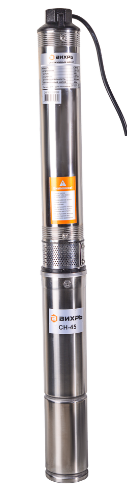 Электронасос бытовой скважинный ВИХРЬ СН-45 предназначен для подачи воды в бытовых условиях из скважин, может использоваться также для подачи воды из шахтных колодцев, резервуаров и открытых водоемов для полива садов и огородов. Насосная часть выполнена в виде блока пластиковых импеллеров. Забор воды посередине между двигателем и блоком импеллеров. Преимуществами являются высокая производительность и надежность. Высокий ресурс работы. Допускается высокое содержание песка в воде.