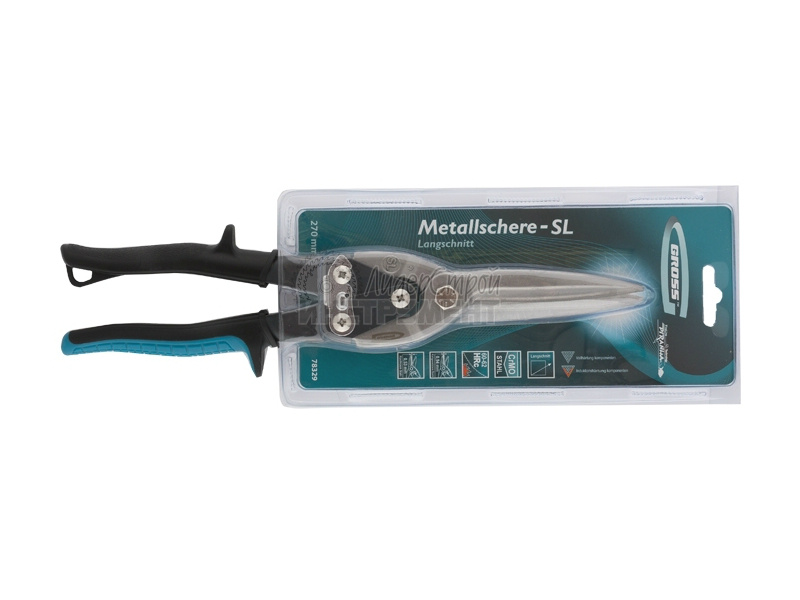 Ножницы по металлу торговой марки GROSS предназначены для проходного прямого и левого реза листового металла толщиной до 1,2 мм и нержавеющей стали толщиной до 0,7 мм. Рабочие части ножниц изготовлены из высоколегированной стали (CrMo), содержание молибдена и ванадия в ее составе придает необходимую жесткость и высокую твердость. Режущие губки проходят процесс индукционной закалки и имеют твердость 60–62 HRС. Ножницы общей длиной 270 мм оснащены эргономичными двухкомпонентными рукоятками, оригинальная форма которых минимизирует риск травм и обеспечивает удобство при длительных работах.