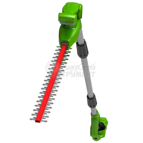 Рукоятка имеет прорезиненное покрытие, а также способна поворачиваться на 180° для простоты и удобства фигурной подрезки. Длина лезвия с алмазной заточкой составляет 57 см., шаг среза равен 18 мм. Этого достаточно для большинства задач. Важным фактором при выборе аккумуляторного кустореза является время автономной работы. В данном случае это устройство может работать до 80 минут от 4 А/ч батареи. Приятным фактором является простота эксплуатации такого устройства - вам не придется таскать за собой шнур и быть привязным к розетке, а так же вам не нужно заботиться о замене свечей или фильтров с маслом, смешивать бензин с маслом при использовании бензиновой техники. Еще одним преимуществом аккумуляторной техники является малый уровень шума и вибрации, а также отсутствие вредных выхлопов.