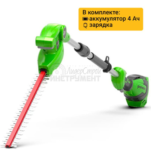 Кусторез штанговый аккумуляторный Greenworks G40PHAК4 — кусторез из серии 40V для подрезки деревьев и живой изгороди. Имеет лезвие 51 см с шагом среза 27 мм. Оснащен щеточным двигателем и составной штангой. Длина достигает до 300 см.