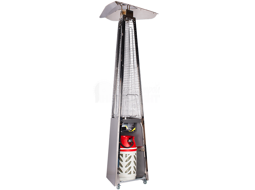 Уличный камин изготовлен из устойчивой к коррозии легированной нержавеющей стали и защищен от попадания атмосферных осадков сверху четырехгранным отражателем, площадь поверхности которого составляет 0,5 м². За безопасность эксплуатации отвечает многоуровневая система защиты. Датчик наклона отключает пламя при наклоне газового обогревателя более чем на 45°, термоэлектрический датчик и электромагнитный клапан сразу же останавливают подачу газа в критических ситуациях, таких как затухание пламени или утечка газа. За счёт встроенной колёсной базы обогреватель свободно и безопасно можно перемещать по любой поверхности.