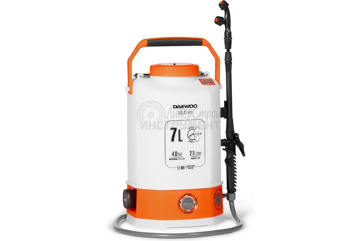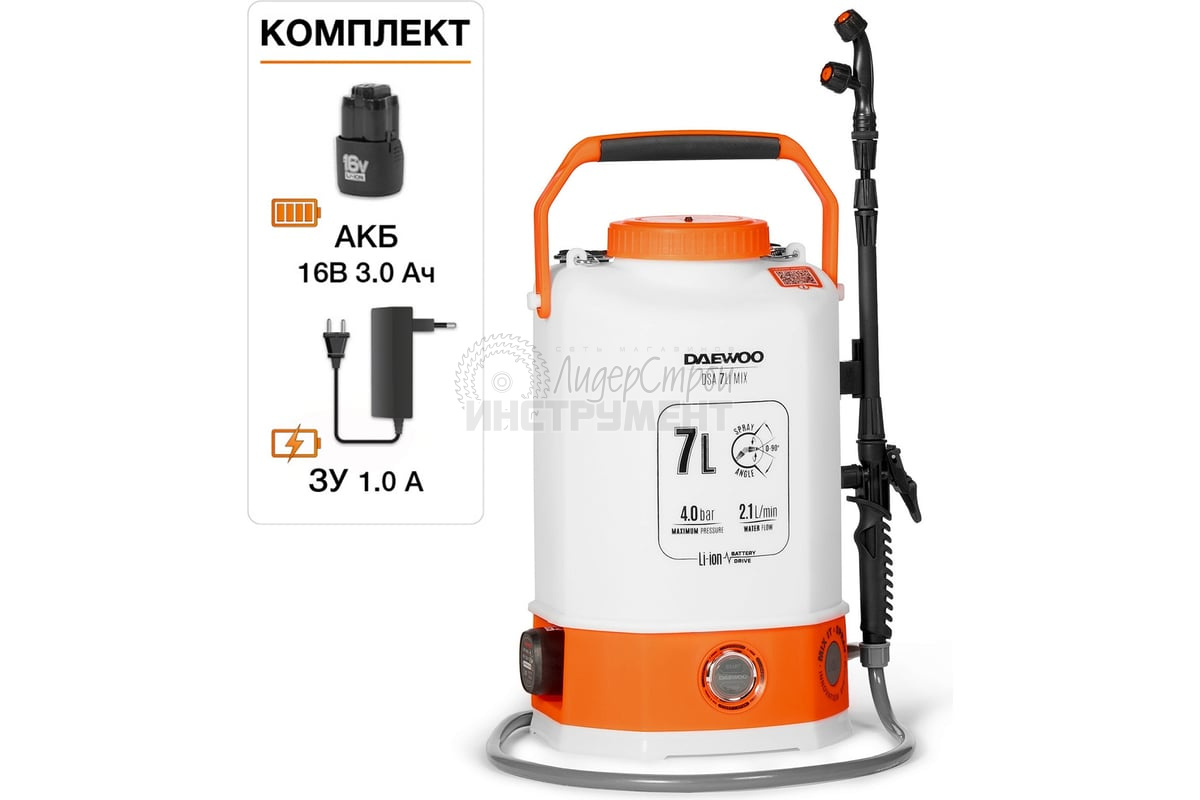 Опрыскиватель аккумуляторный DAEWOO DSA 7Li MIX оснащен 7-литровым баком. Модель наплечного типа отличается удобством перемещения и использования. Агрегат обеспечивает расход жидкости 2.1 л/мин. Опрыскиватель аккумуляторный DAEWOO DSA 7Li MIX поставляется с АКБ и зарядным устройством. Особенности модели – кнопка START/STOP и функция смешивания.