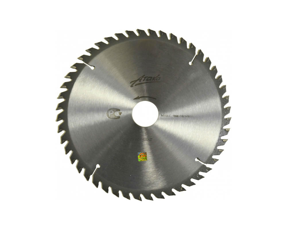 Профессиональный отрезной круг для качественной резки ламината, заготовок из ДСП, фанеры и пр. Профиль зубчиков — плоский с прямым наклоном. Артикул 8077980.