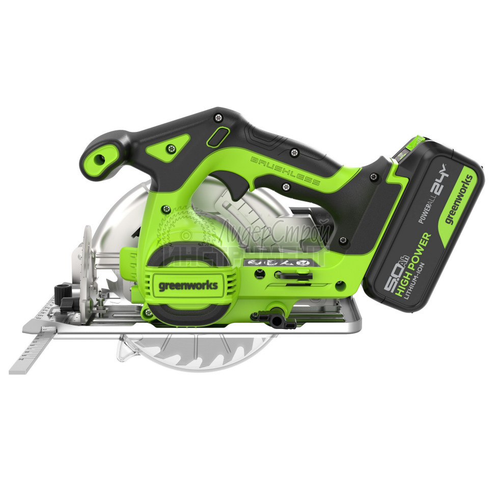 Дисковая пила аккумуляторная Greenworks GD24CS165, 24V,б/щет, 165х20мм, 4800 об/мин, рез 57мм,1х5Ач, ЗУ — мощная и легкая аккумуляторная дисковая пила для универсального применения на стройплощадке и в мастерской. Легко режет древесину толщиной до 57 мм!