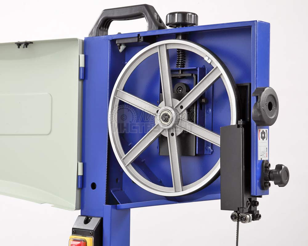 На станке используются пильные полотна шириной от 9,5 до 37 мм, что позволяет осуществлять как прямолинейный, так и фигурный распил. Ослабление натяжения полотна осуществляется специальным рычагом в одно движение.