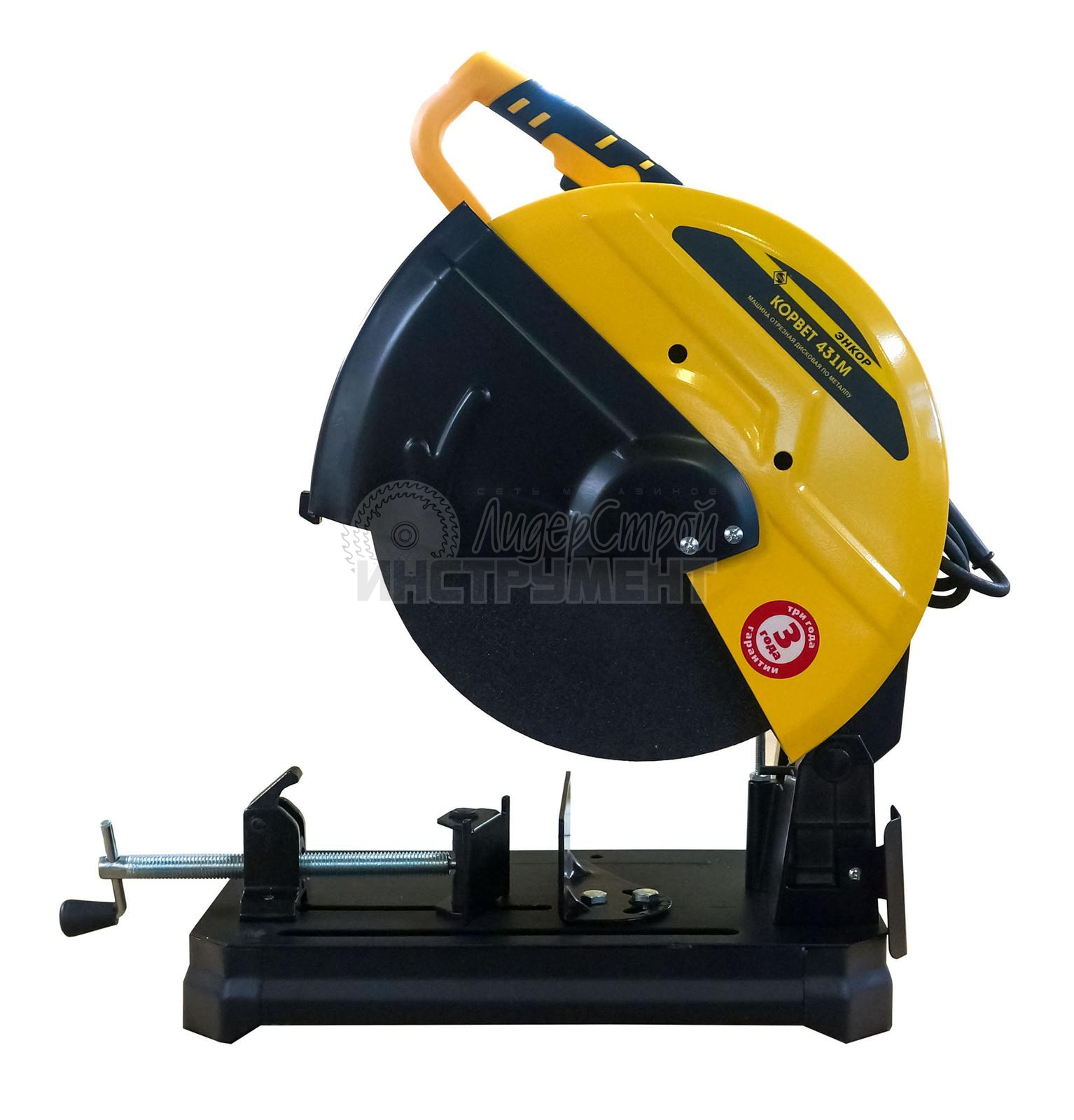 Тиски, которыми комплектуется станок, являются поворотными, в них можно зажать и отрезать заготовку под нужным углом. Для безопасности оператора Корвет 431М оснащен защитным кожухом.