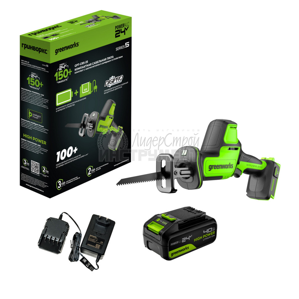 Пила сабельная аккумуляторная Greenworks GPT-CRS-25, 24V, б/щет, 0-3000/мин, рез 80 мм дер., LED, 1х4Ач, ЗУ — компактный инструмент, который помогает в работе множеству профессий и на приусадебном участке.