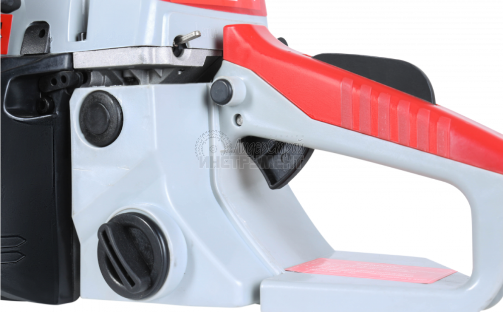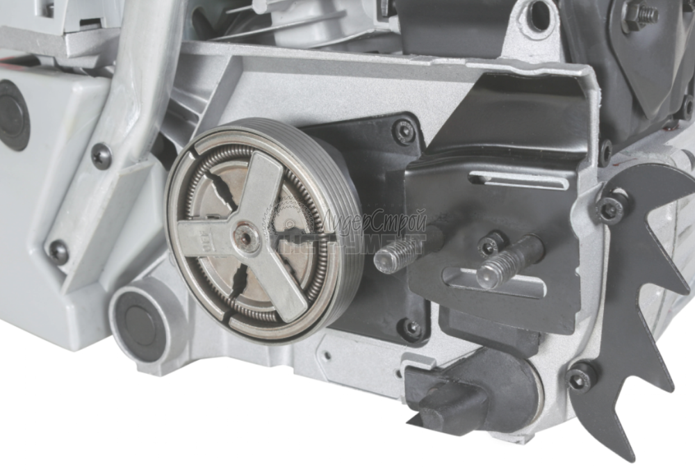 легкий доступ к натяжителю цепи. Натяжитель расположен сбоку на корпусе и регулируется без инструмента. Расположение снижает риск травмы при случайном касании цепи и звездочки;
