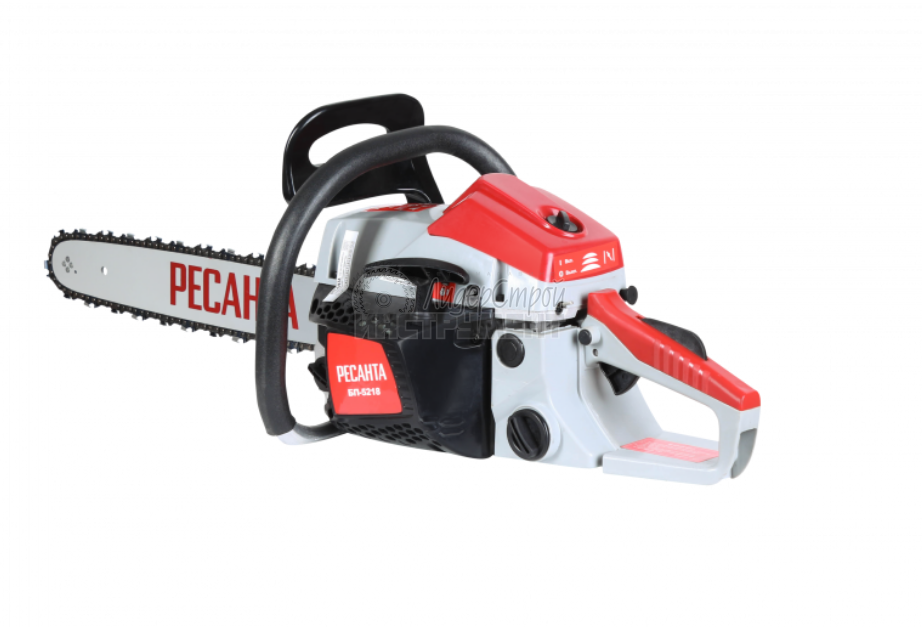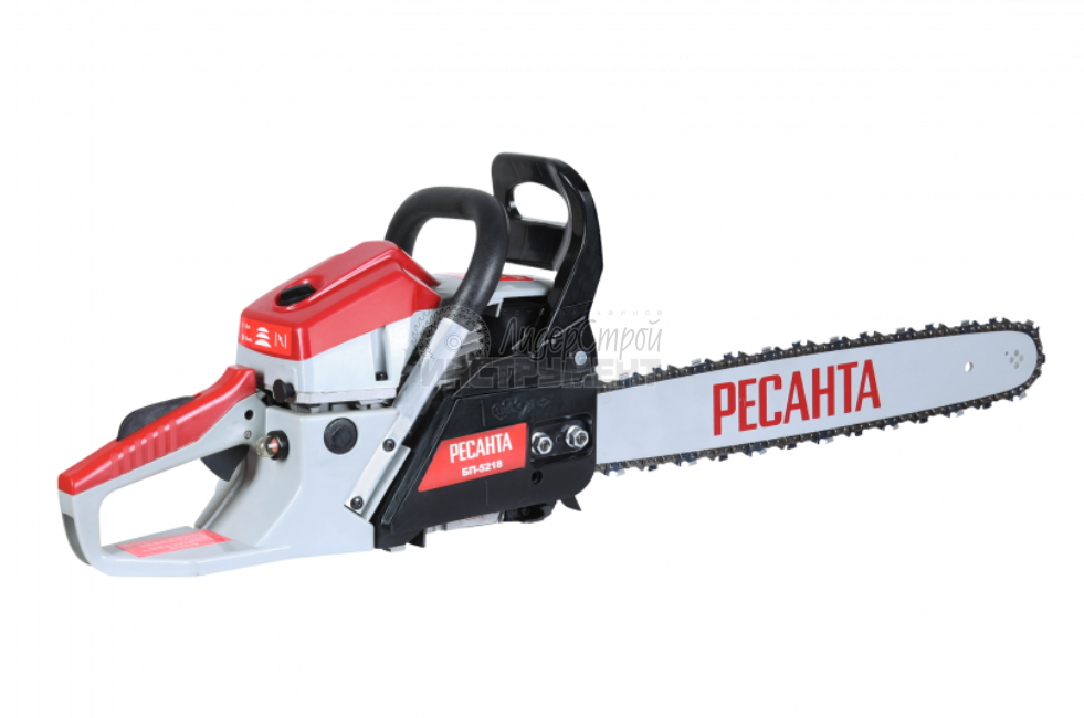 Бензопила БП-5218 Ресанта. Этот мощный агрегат обладает долговечной конструкцией, отличной маневренностью, позволит справиться с задачами любого уровня сложности. Новинка БП-5218 Ресантаимеет длину шины – 18 дюймов и количество звеньев цепи - 72 звена. Резиновые амортизаторы, расположенные между рукоятками и картером пилы, снижают вредную вибрационную нагрузку при работе с бензопилой, делают работу комфортнее. Масляный бак размещается в передней части картера. Принудительная смазка цепи и шины применяется для снижения трения между ними, что увеличивает срок службы пильной гарнитуры. Легкий старт влияет на скорость запуска, особенно в зимний период. Он добавляет дополнительный крутящий момент при рывке. Безопасности в этой модели уделено много внимания. Блокировки курка газа предотвращает случайное нажатие. Функция механического инерционного тормоза цепи также важна: при резком отскоке пилы во время пиления (вверх и назад) рука упирается в ручку тормоза и отщелкивает ее, а тормозная лента затягивается и тормозит барабан сцепления, цепь при этом останавливается практически мгновенно. Защитный щиток в случае разрыва цепи или ее соскока с шины предотвращает травмирование.