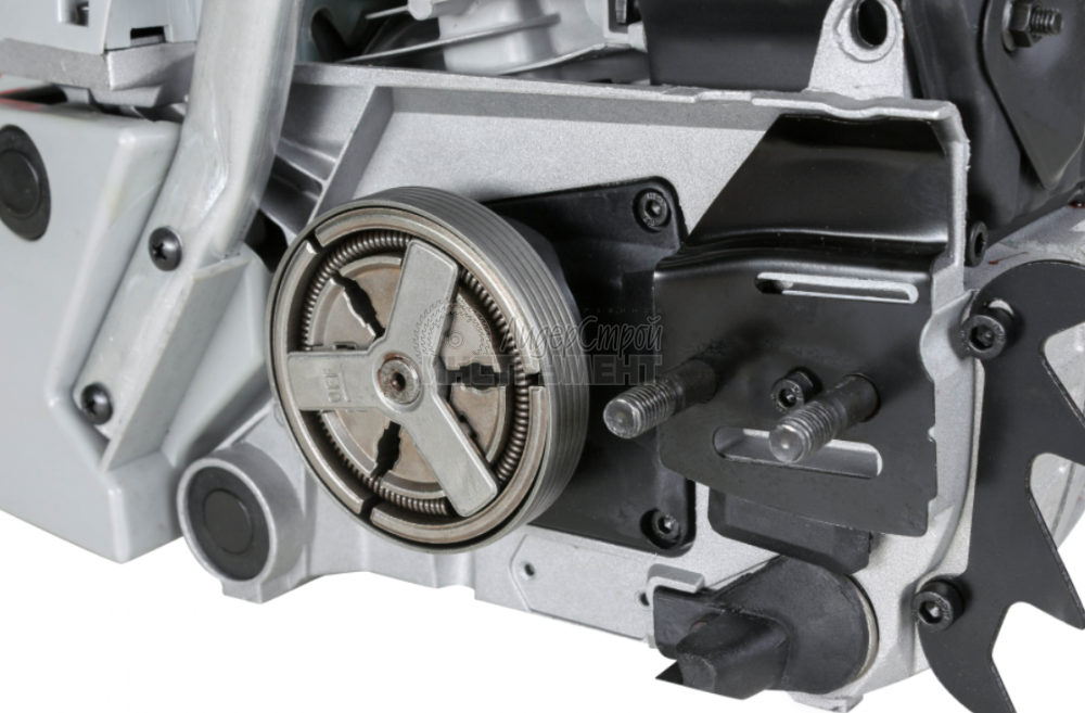 легкий доступ к натяжителю цепи. Натяжитель расположен сбоку на корпусе и регулируется без инструмента. Расположение снижает риск травмы при случайном касании цепи и звездочки;