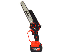 Аккумуляторная цепная пила удобно лежит в руке благодаря прорезиненной рукоятке. Для безопасности оператора предусмотрены защита от случайного пуска и защитный кожух цепи. В модели BCHS 20-4NMBL длина шины составляет 20 см под цепь из 46 звеньев с шагом ¼. Ее необходимо смазывать каждые 10 - 15 пропилов, т.к. инструмент оснащен ручной смазкой  цепи.