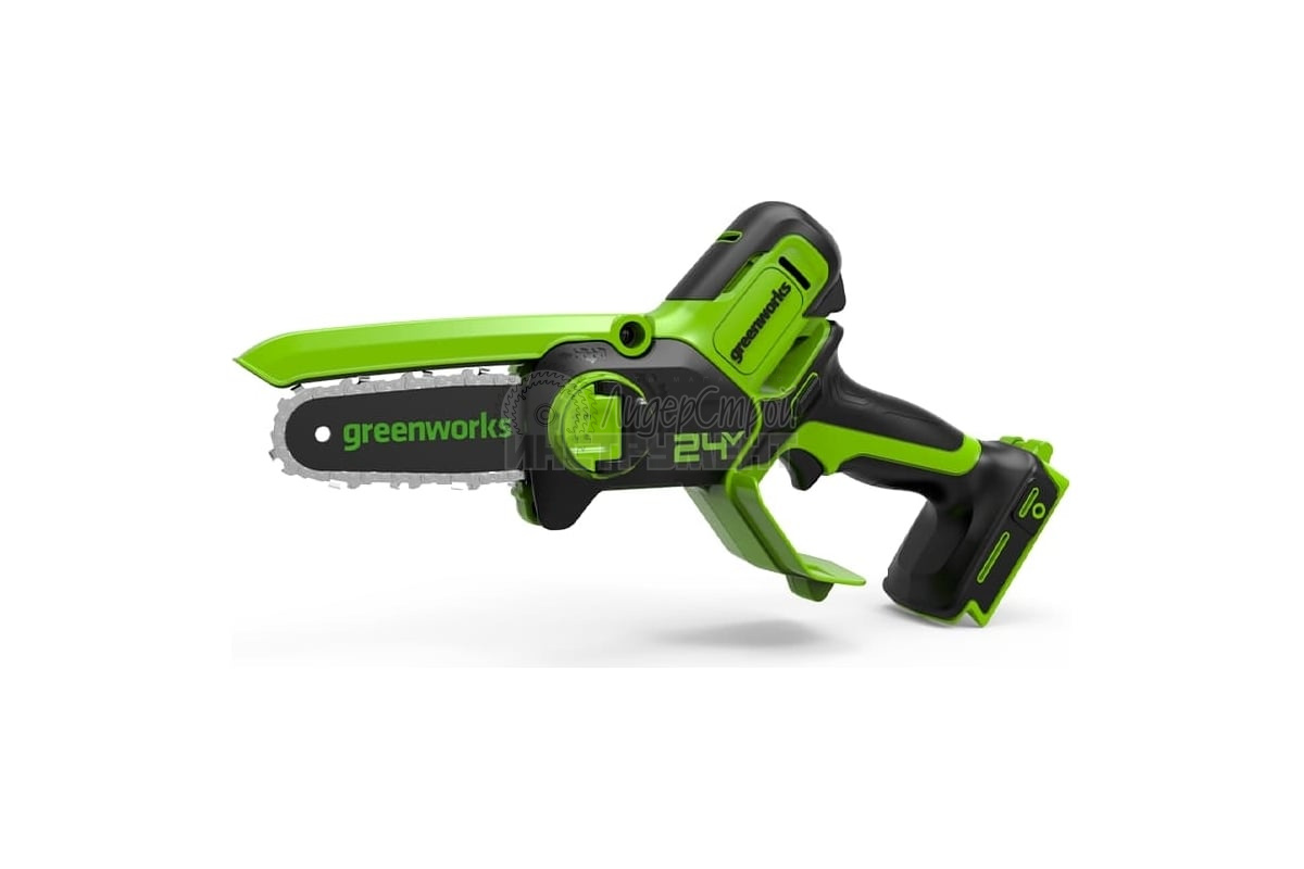Цепная аккумуляторная мини пила GreenWorks 24V, 15 см, бесщеточная, предназначена для распила сучьев и кустарников.