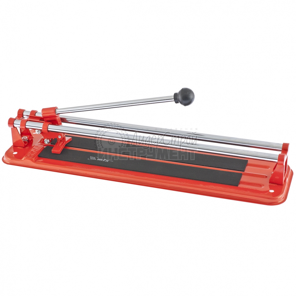 Последняя разработка Mtx. Плиткорез имеет только один направляющий рельс - двутавровую рейку из специального стального сплава. Несущая каретка инструмента охватывает рельс с двух сторон и передвигается посредством шарикоподшипникового механизма. Прижимной обхват рельса каретки регулируется специальным болтами, в результате достигается полное отсутствие люфта между кареткой и рельсом и максимальная устойчивость рукоятки при резке. Специальный сплав и покрытие рейки обеспечивает надежное сцепление шарикового механизма с рельсом и исключает проскальзывания каретки при работе. Стоит особо отметить легкий ход рукоятки плиткореза. Станина традиционной формы из алюминиевого сплава значительно облегчает и придает инструменту мобильность